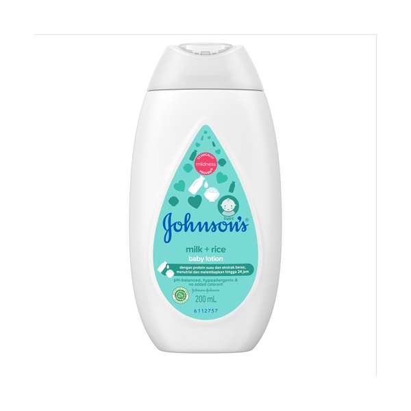 Johnson's ® Milk + Rice baby lotion dengan kandungan susu dan beras bermanfaa untuk bantu menyehatkan kulit bayi dengan kelembapan 24 jam.