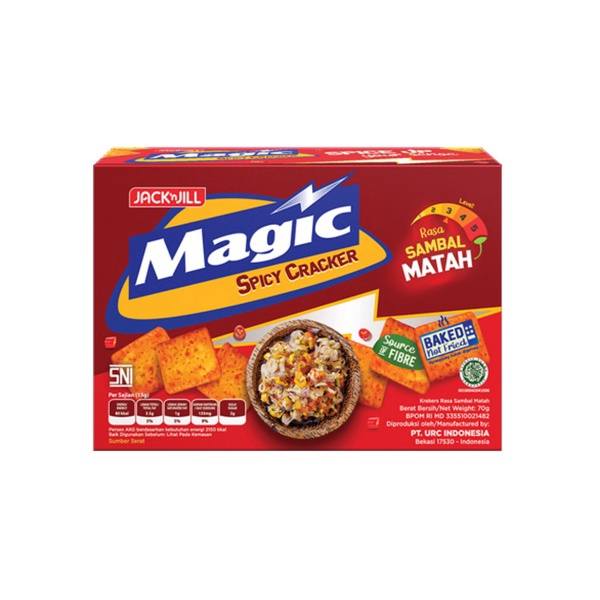 Magic Spicy Cracker adalah kerupuk pedas lezat dengan tepung berkualitas tinggi dan di panggang dengan kerenyahan yang tak tertahankan,setap kerupuk seukuran gigitan memberi anda kenikmatan pada tingkat suara dan tesktur, dan dengan cita rasa sambal matah lokal yang otentik , memberikan perpaduan sempurna antara bawang bombay, cabai dengan jeruk nipis , yang menghadirkan tendangan pedas eksplosif untuk meningkatkan momen ngemil anda.