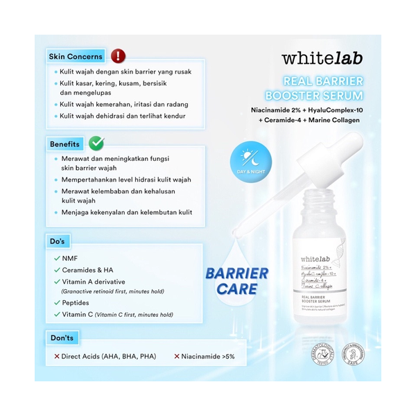 Whitelab Real Barrier Booster Serum dengan kandungan Niacinamide 2%, HyaluComplex-10, Ceramide-4, Marine Collagen bekerja sinergis merawat dan meningkatkan fungsi skin barrier wajah, kulit tampak sehat dan tidak kusam. Gunakan pagi dan malam hari sebelum menggunakan krim wajah.