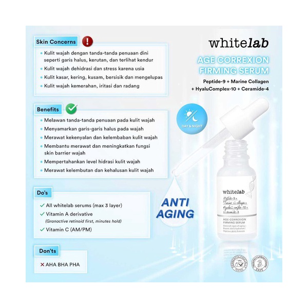 Whitelab Age Correxion Firming Serum menggunakan Peptide-9, Marine Collagen, HyaluComplex-10, Ceramide-4 yang dapat melawan tanda-tanda penuaan dini pada wajah. Wajah tampak awet muda, garis halus dan kerutan berkurang dan tetap terasa kenyal.