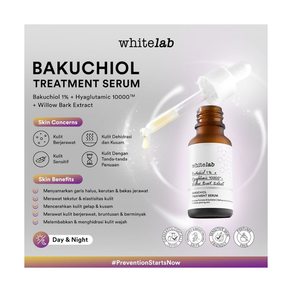 Whitelab Bakuchiol Treatment Serum mengandung Bakuchiol 1%, Hyaglutamic 10000 TM, dan Willow Bark Extract yang dapat membantu merawat keremajaan kulit wajah, menyamarkan garis halus dan kerutan akibat penuaan dini, serta dapat merawat kulit berjerawat dan bruntusan.
