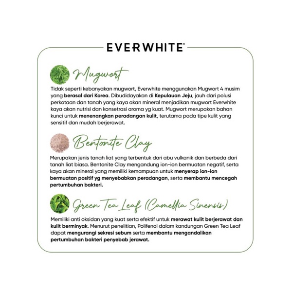 Wash-Off Mask dengan kandungan Bentonite, Mugwort, dan Green Tea Leaf. Diformulasikan berbentuk Clay yang lembut dan mengering dengan cepat, ditambah dengan Green Tea Leaf yang memberikan sensasi menenangkan pada wajah.